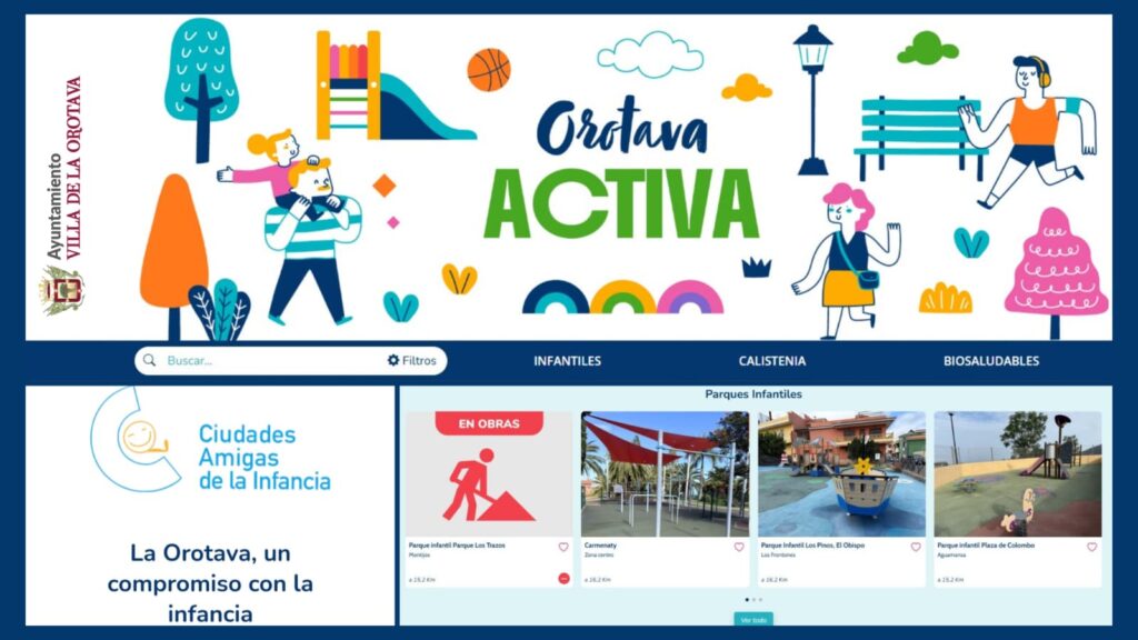 La Orotava cuenta con más de medio centenar de parques infantiles repartidos por todos los barrios del municipio y la zona centro, facilitando así el acceso a estos espacios para las familias con niños y niñas. Además de estas zonas de juego, el municipio ofrece también una quincena de parques biosaludables, dirigidos a personas adultas y mayores y tres parques de calistenia pensados para quienes practican ejercicio físico al aire libre. Con el objetivo de acercar toda esta información a la ciudadanía, el Ayuntamiento ha lanzado una guía digital a través de la web-app www.orotava-activa.es
