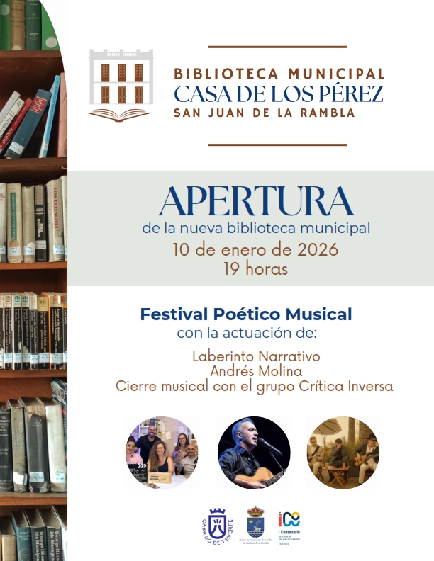 El Ayuntamiento de la Villa de San Juan de la Rambla anuncia que la nueva Biblioteca Municipal de la Casa de los Pérez abrirá oficialmente sus puertas el próximo sábado 10 de enero a las 19.00 horas, tras que la fecha original fuera aplazada el pasado diciembre por la borrasca Emilia. Este acto incluirá un festival poético musical con las actuaciones de Laberinto Narrativo, el cantautor Andrés Molina y un cierre musical a cargo del grupo Crítica Inversa.